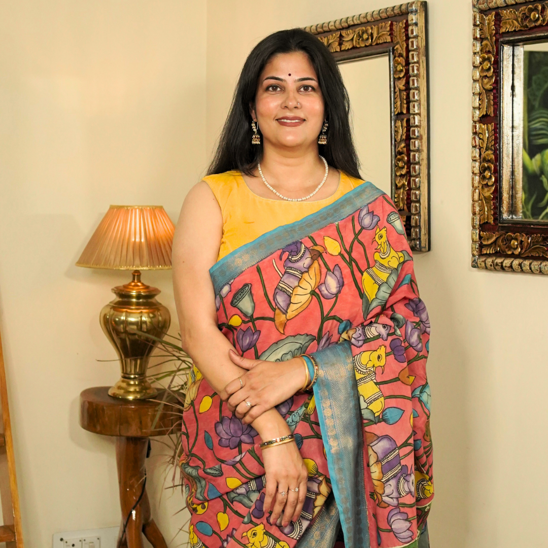 Striped Blue & Pink Kalamkari Silk Saree – Floral Pallu Design